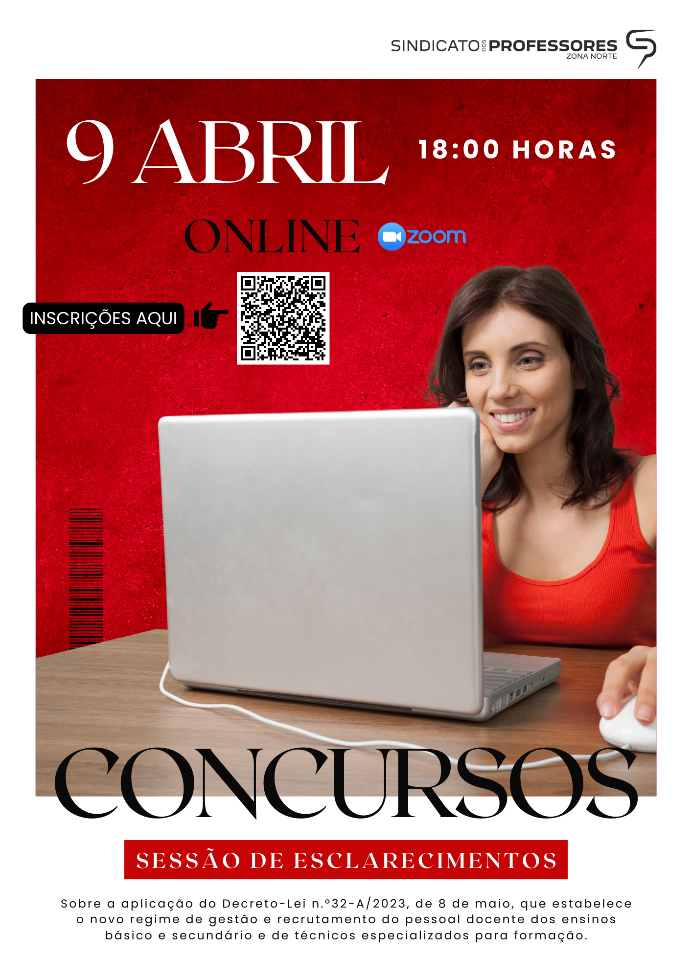 Depois da adesão significativa à sessão de esclarecimentos realizada em Viana do Castelo e perante os vários pedidos de realização de uma nova sessão em formato online, o SPZN vai promover, no próximo dia 09 de abril, pelas 18 horas, uma sessão de esclarecimento sobre os Concursos 2024, através da plataforma Zoom.