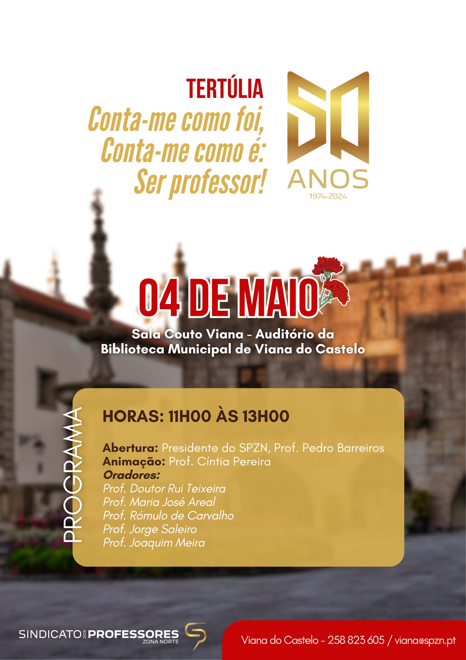 No dia 4 de maio, das 11h00 às 13h00, a Sala Couto Viana, na Biblioteca Municipal de Viana do Castelo, vai receber a Tertúlia "Conta-me como foi, conta-me como é: ser PROFESSOR!". Este é um evento promovido pela Direção Distrital do SPZN de Viana do Castelo, como forma de celebração dos 50 anos de Liberdade e 50 anos de existência do SPZN.