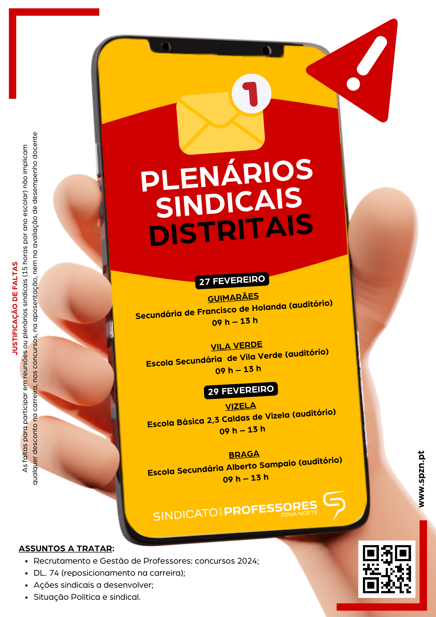Dada a premência de se debaterem questões, de âmbito socioprofissional, com que se defrontam os Educadores e Professores, o Sindicato dos Professores da Zona Norte – SPZN convoca para os dias e locais, identificados nesta convocatória, ao abrigo do artigo 341º da Lei n.º 35/2014 de 20 de junho, (Lei Geral do Trabalho em Funções Públicas) LTFP e do artigo 420º da Lei n.º 7/2009 de 12 de fevereiro, que aprovou a revisão do Código do Trabalho, com as alterações subsequentes, Plenários/Reuniões Sindicais Distritais, a realizar de forma descentralizada.