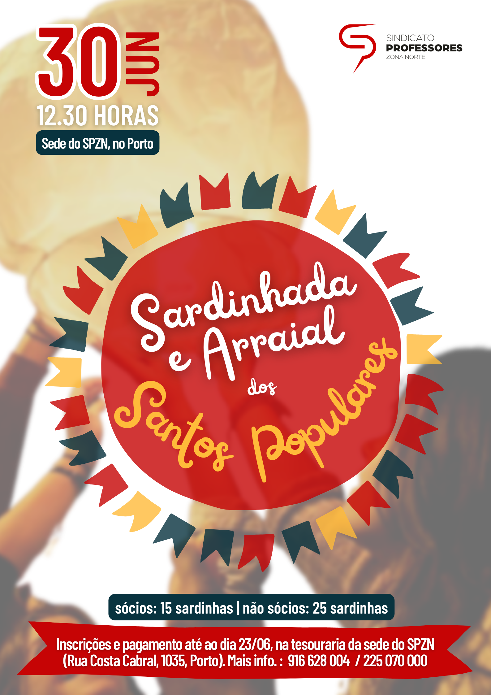 As inscrições estão abertas até ao dia 23 de junho e devem ser feitas, juntamente com o pagamento – 15 sardinhas para sócios e 25 para não sócios –, na Tesouraria do SPZN, no Porto.