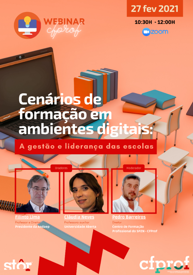 Com o objetivo de contribuir para um debate alargado e informado sobre a temática da formação em ambientes digitais, o Centro de Formação Profissional (CFProf) do Sindicato dos Professores da Zona Norte, realiza no próximo dia 27 de fevereiro de 2021, pelas 10:30 horas, o webinário "Cenários de formação em ambientes digitais: A gestão e liderança das escolas" que terá como oradores convidados: